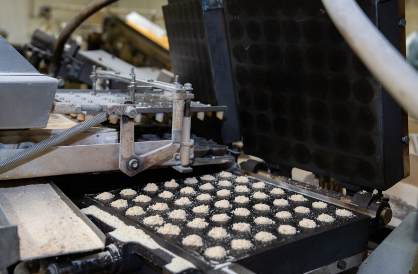そのえびせんべいは、生地を型で押しながら焼き上げる「押し焼き」という方法でつくられています。